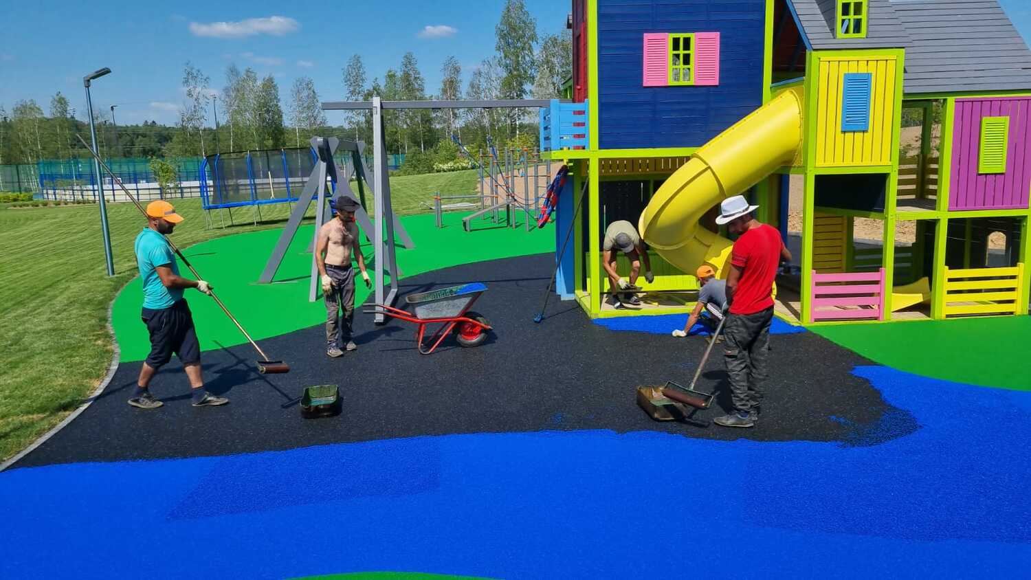 Монтаж детской площадки и заливка резинового покрытия в два слоя